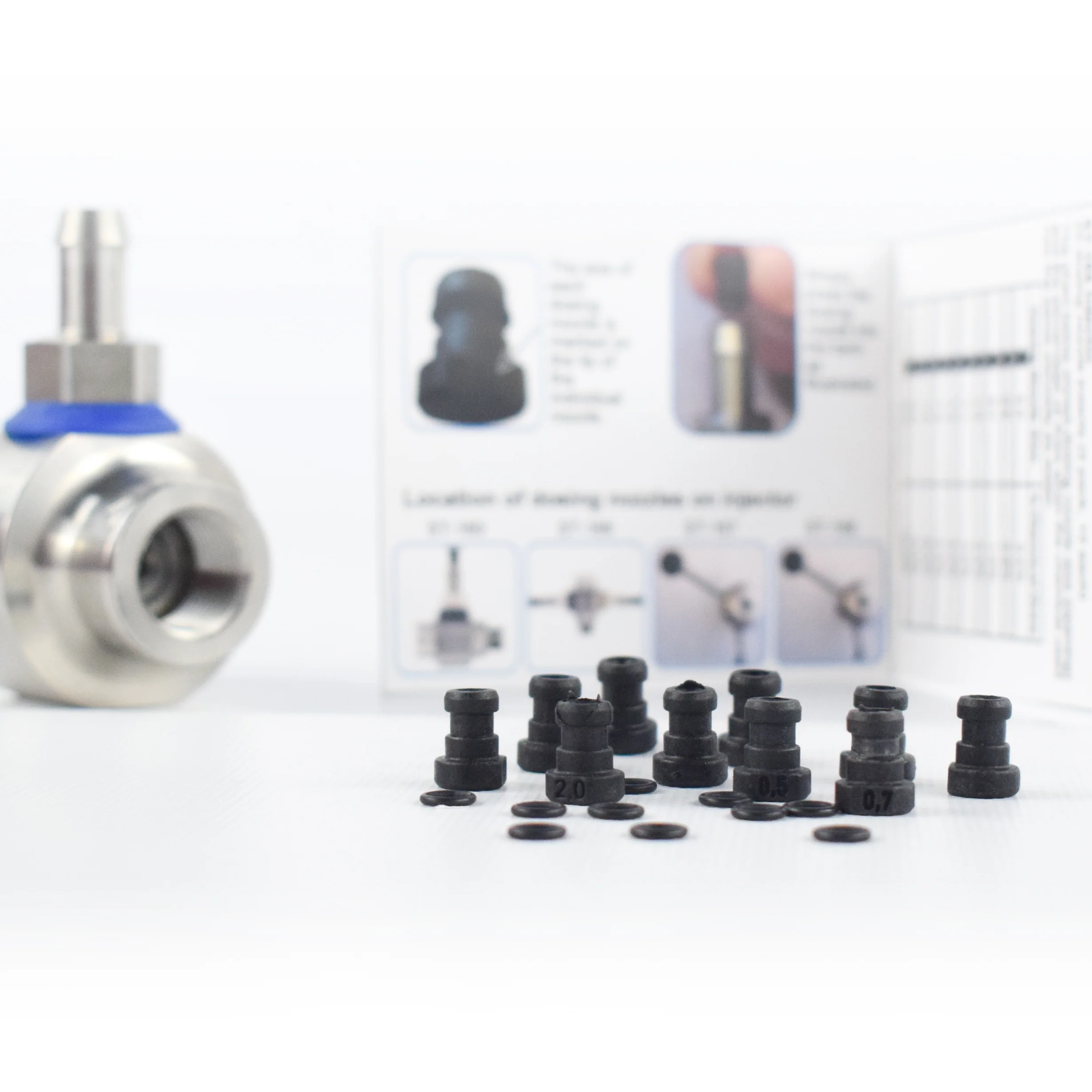 10 Replacement dosing nozzles & O-rings for Suttner Injectors. The dosing nozzle inserts are used to control the chemical draw. This 10 Pack Includes one each of the following sizes: 0.5 / 0.6 / 0.7 / 1.0 / 1.1 / 1.3 / 1.5 / 1.7 / 2.0
